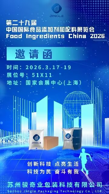 Technologie d'emballage Cie., Ltd de Suzhou Jingle. est heureux d'annoncer sa participation au prochain Ingrédients alimentaires Chine 2026 exposition. L'événement aura lieu du 17 au 19 mars 2026 à la Centre national des expositions et des congrès (Shanghai) . Les visiteurs sont invités à rencontrer l'équipe d'experts de l'entreprise à Kiosque 51X11 pour explorer des solutions d'emballage complètes et discuter de collaborations potentielles.